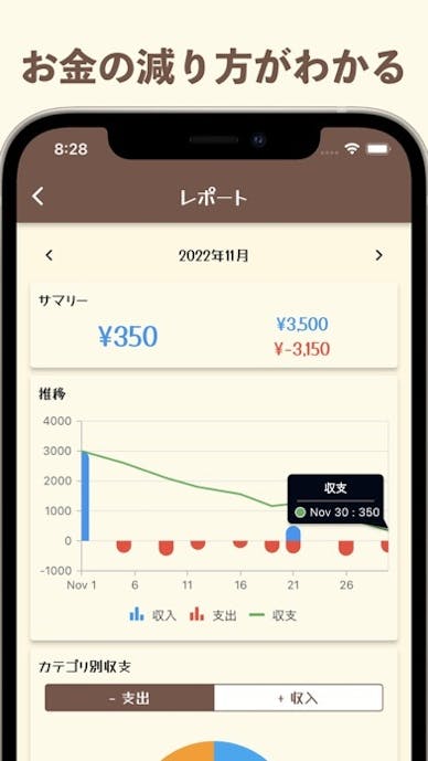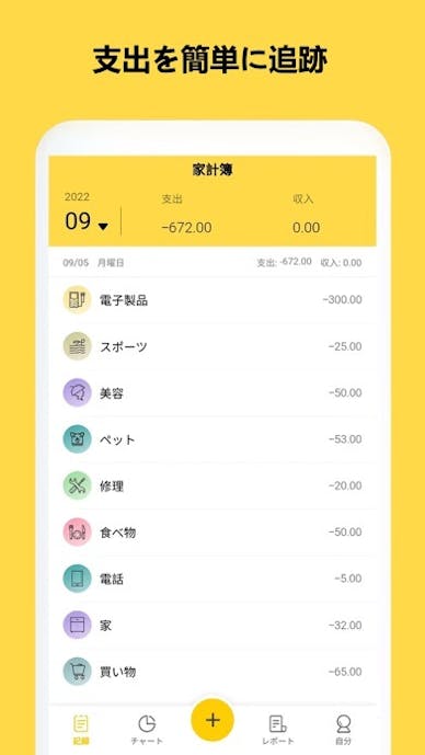 カテゴリー管理やレポート機能も備わり、日や月ごとの収支を一目で確認可能。