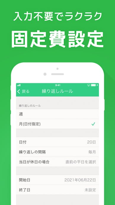 固定費の自動反映に対応しており、毎月の定期支出を自動化できるのも魅力。