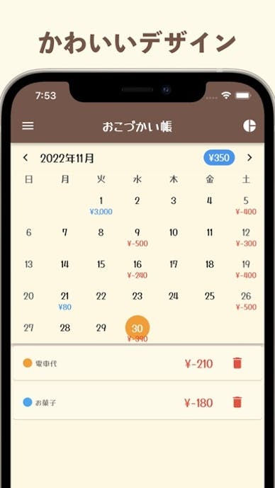iPhoneユーザーはこちら Androidユーザーはこちら第4位. かわいいおこづかい帳:毎日の収支がカレンダーでわかる!お金の流れをグラフで振り返れるシンプルなお小遣い帳アプリ
