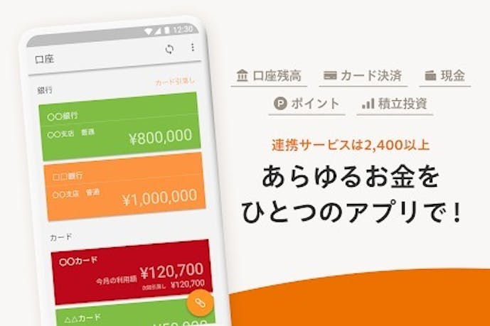 入力は手入力に加え、1,200以上の銀行やカードと連携して自動取得。