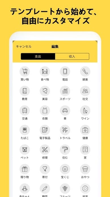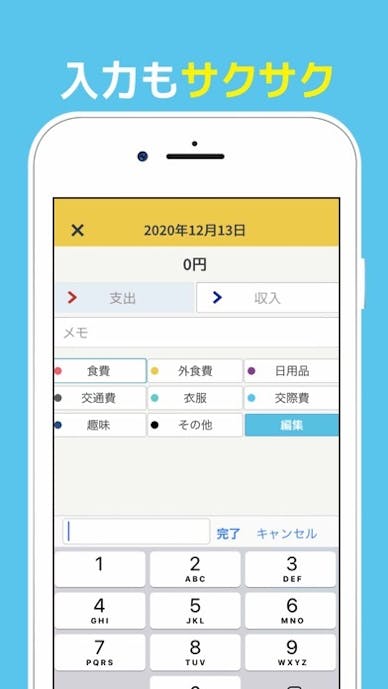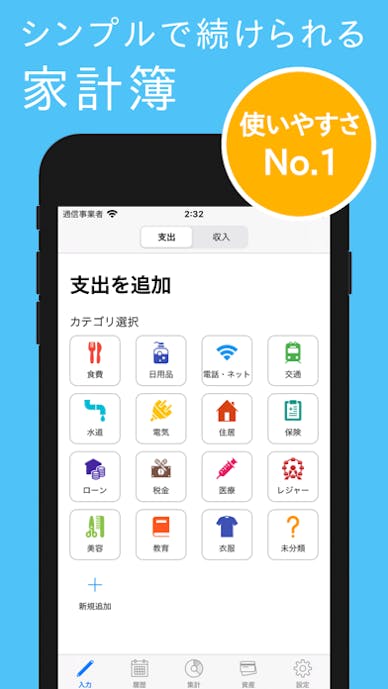 よく使う収入・支出カテゴリが最初から用意され、画面遷移が少ないので買い物直後にサッと記入できます。