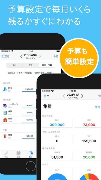 固定費の自動記入に対応しており、家賃や通信費などの定期支出の入力を省けるのも便利。