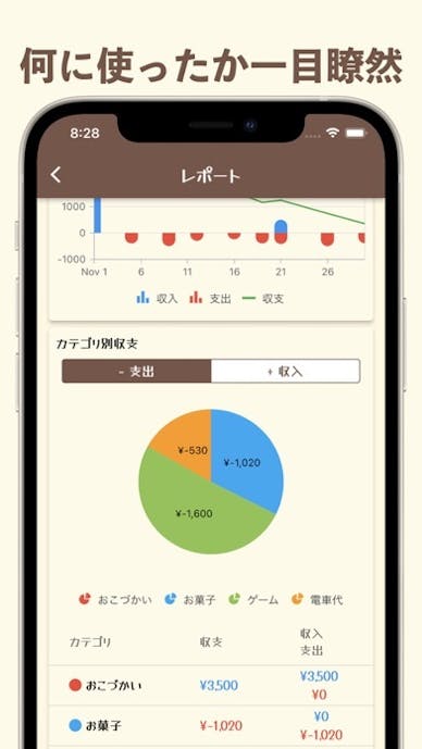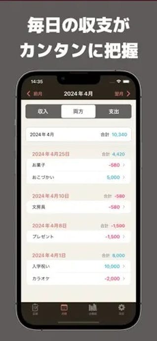 毎日の収支がカレンダーでわかる! 流れをグラフで見れるシンプルなお小遣い帳アプリ |