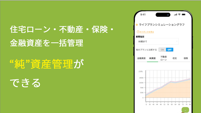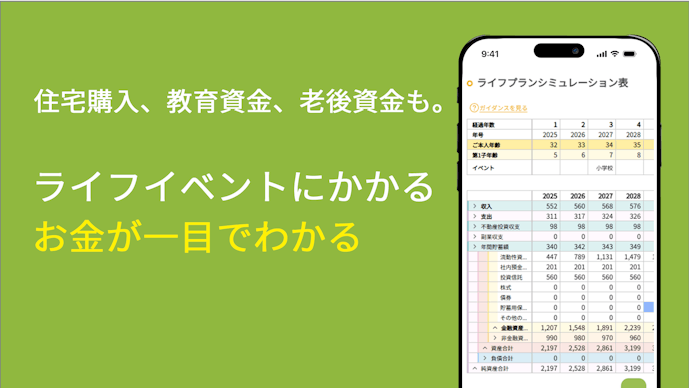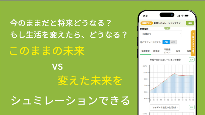 住宅購入や教育費、老後資金など将来のイベントを登録し、目標金額と時期を設定するだけで、資産の推移と差をグラフで確認できます。