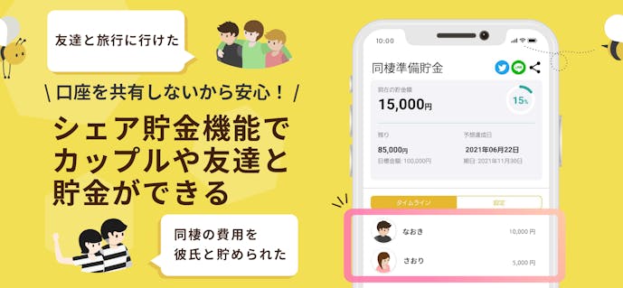 さらに、ペア家計簿機能でパートナーと共有すれば、二人で協力しながら貯金目標に近づけます。