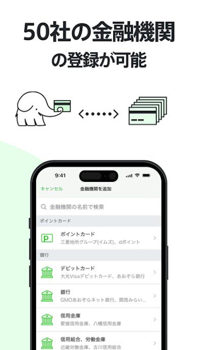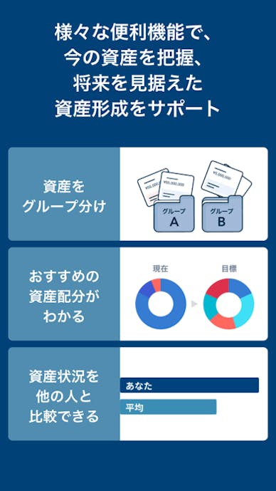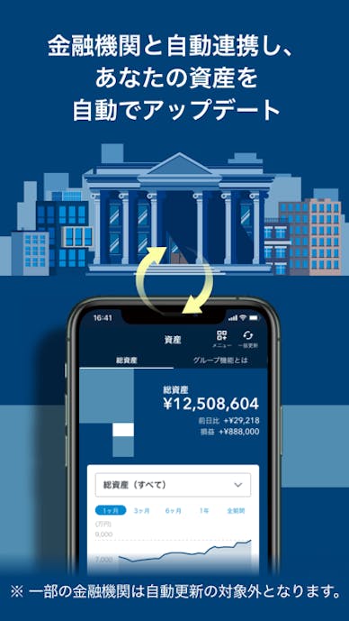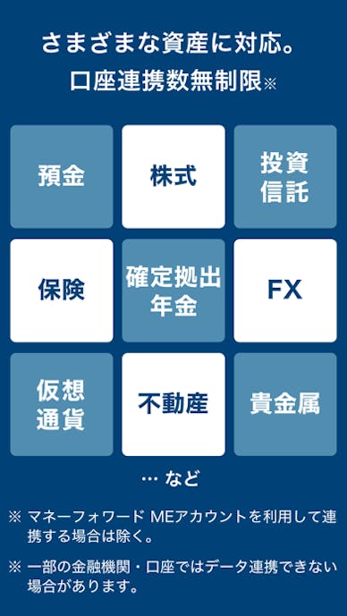 銀行・証券・クレカ・電子マネー・ポイント・仮想通貨まで幅広く連携でき、全体像を一画面で把握できます。