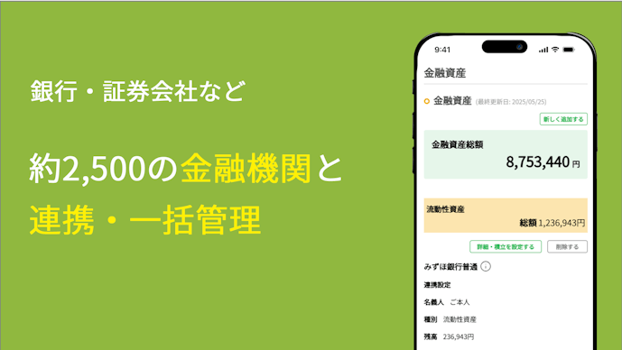 銀行・クレカ・証券など約2,500の金融機関と連携すれば、収支や残高が自動で集約。