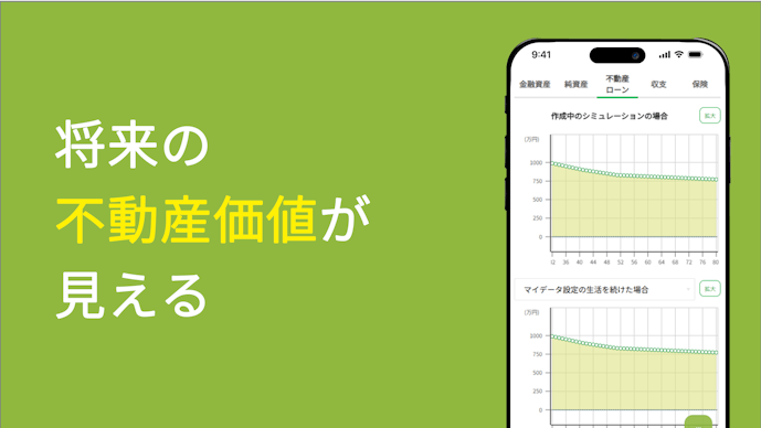 家計簿として一括管理しながら、保険や不動産の資産価値予想も確認できます。