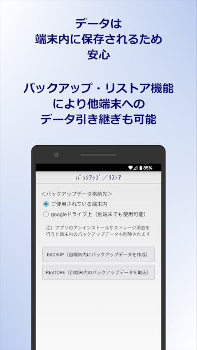 データはCSVでバックアップ/復元でき、Dropbox対応な上に、パスコードロックも備わっているため安心感があります。