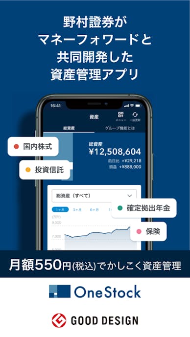 『OneStock』は、「いつまでにいくら貯めるか」を数字で決め、資産をまとめて管理できる野村の資産管理アプリ。