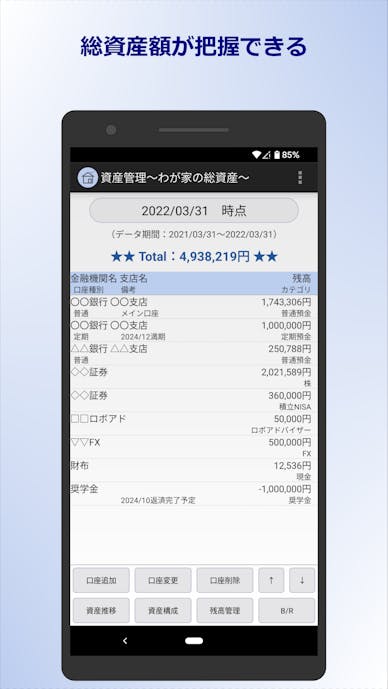 『資産管理・ポートフォリオ』は、株や預金など複数の資産残高を手入力で更新し、総資産を自動集計できるシンプルな管理アプリ。
