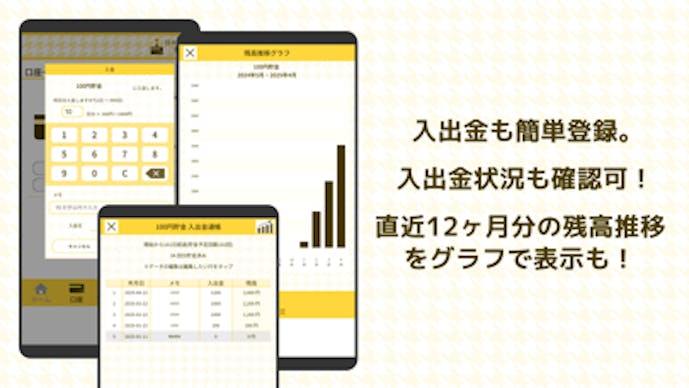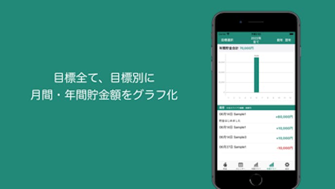 各目標の達成率や月・年ごとの貯金額はグラフでひと目で確認でき、複数の貯金を同時に見える化できる点が魅力。