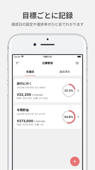 複数の目標を同時に管理でき、旅行や家電など目的別に進捗を追えるのが魅力。