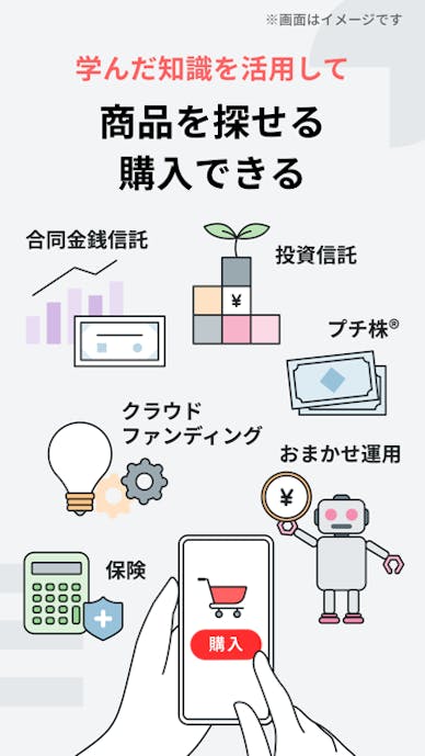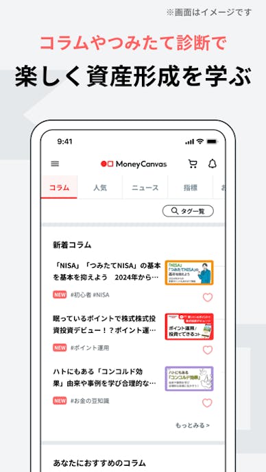 さらに、学べる「コラム」や「つみたて診断」も搭載され、気に入った金融商品の購入手続きまで進められますよ。