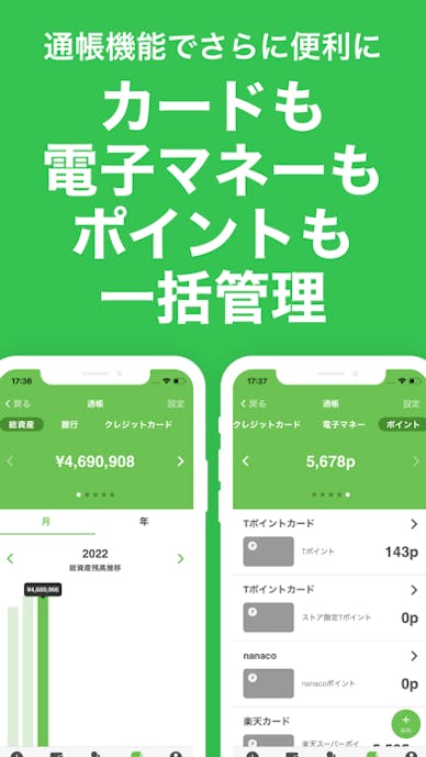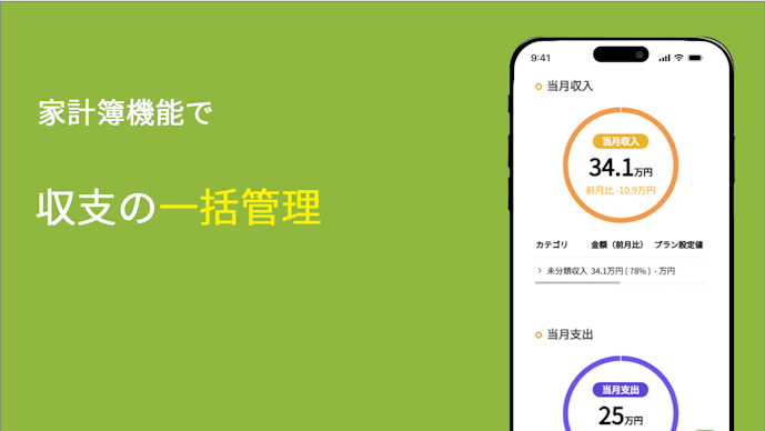 銀行・クレカ・電子マネーを連携するだけで入出金が自動で家計簿化され、資産や収支まで一目で把握できます。