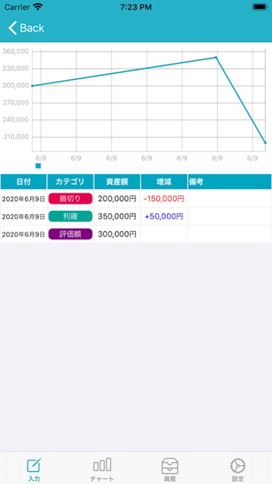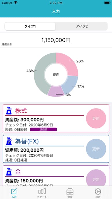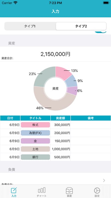 資産だけでなく負債も登録でき、純資産の全体像をグラフで確認できる珍しいアプリです。