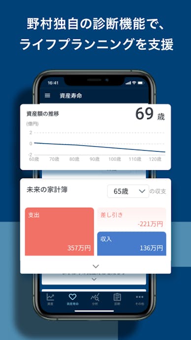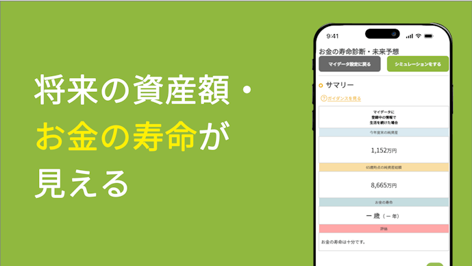 ボタン一つで「お金の寿命」を可視化でき、将来に必要な金額とのギャップがわかりやすく表示されるのが特徴です。