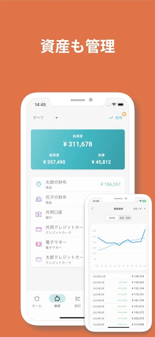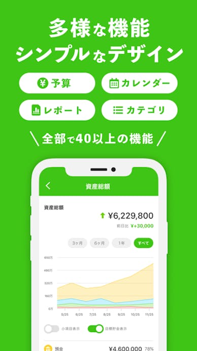収支や資産の推移もチャートで見えるため、通帳感覚で管理ができます。