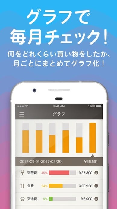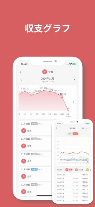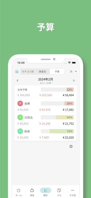 月ごとの予算管理や費目別のグラフ表示が揃っており、使いすぎをひと目で把握できます。