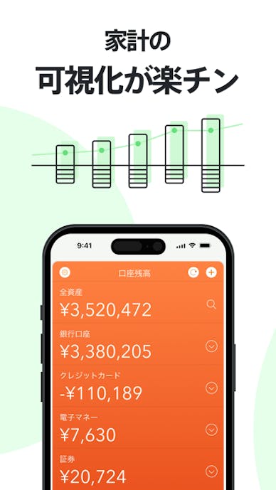 口座の入出金は自動で取得され、残高や資産の流れはグラフで直感的に把握できます。