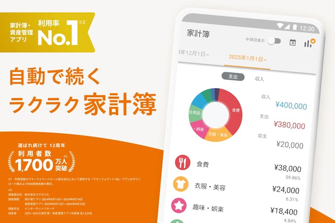 入出金や支出をAIが自動分類してグラフ化! 数字を追って家計の流れを掴める無料家計簿アプリ |