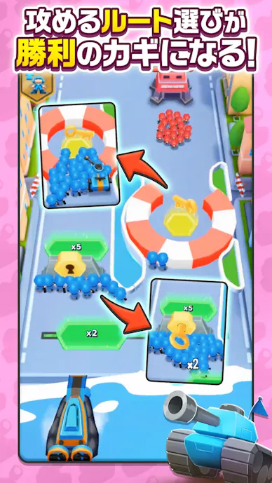 遊び方は、タワーを並べて守るというより、兵をどの道へ流すかを考えて敵基地を落としていく流れ。