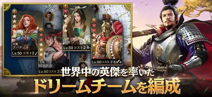 バトルはフルオート進行で、自ら操作して斬るのではなく、軍隊編成や作戦指示が勝敗を分けます。