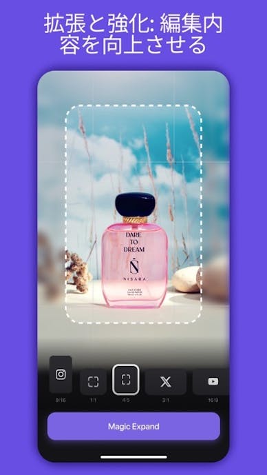 写真と動画のどちらにも対応しており、Instagramなど各SNSのフォーマットに合わせて簡単に保存・投稿できます。