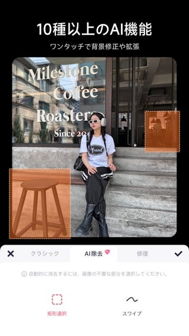 静止画では比率調整や縦長サイズの作成でストーリーに最適化でき、不要な人や物をAI除去で自然に消すこともできます。
