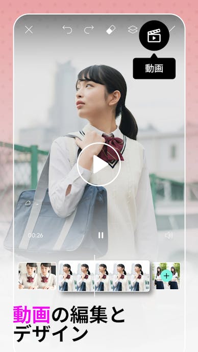 動画編集にも対応しており、テキストやスタンプ追加、BGMの取り込み、最長30分の編集、人物補正までカバー。