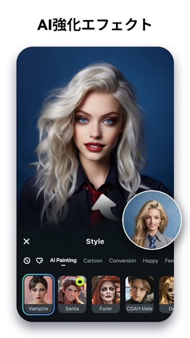 iOS/Android両対応で、写真を取り込み「アニメ風/カートゥーン」の効果をかけると、コミカルなタッチに早変わり。