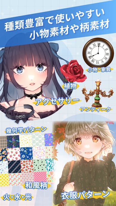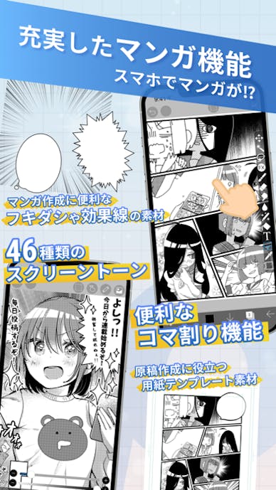 「マンガ調背景」素材を使えば、キャラを際立たせるポップな背景も簡単に作成できます。