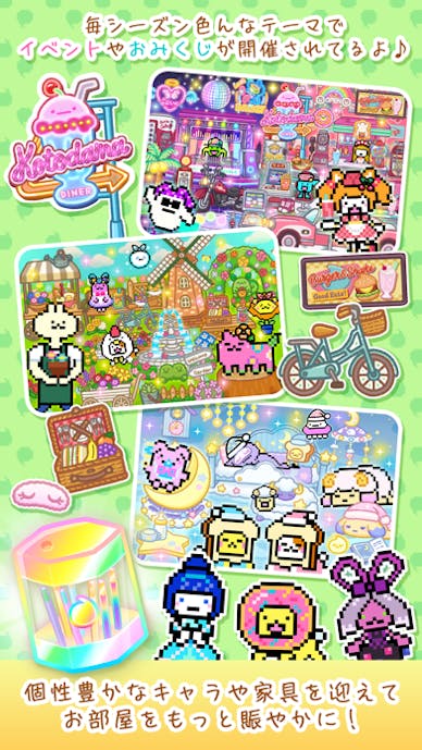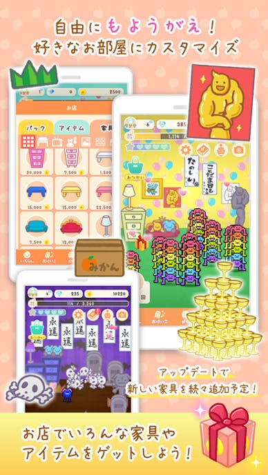 集めたごっちPで食べ物・衣装・家具を購入し、部屋や街並みを自由に飾り付け。