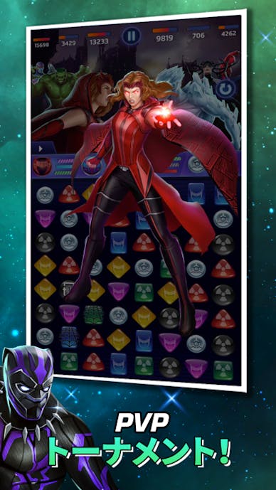 宝石をそろえてコンボを作るたびに、編成したヒーローが必殺技を放つ“消す×戦う”システムで、テンポのよいバトルが続きます。