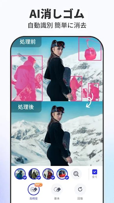 AI自動検出ではなく、指の操作で細部を丁寧に調整するタイプで、境界線を自分の手で整えて仕上げたい人に人気です。