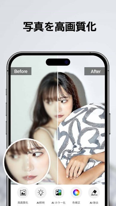 昔の家族写真やピンぼけしたスマホ画像も、1タップで鮮明なHD画質に仕上げられるのが魅力です。