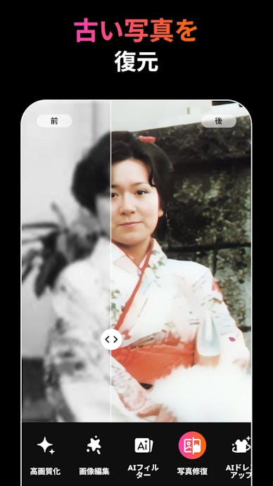 AIが自動でノイズ除去やシャープ化、色補正を行い、白黒写真のカラー化やキズ・破れの修復までワンタップで対応します。
