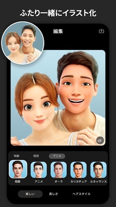 アニメキャラ風・動物変身・リアル系ビジュアル・年齢変化・性別変換まで、スマホひとつでなりたい自分に変身できるのが魅力。