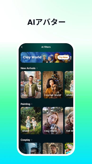 AIフィルターでビジネススーツやレッドカーペット、漫画風ポートレートなど多彩なスタイルを生成可能。
