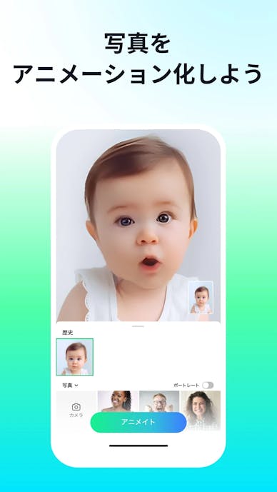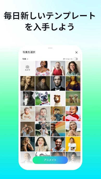 自撮りやペットの写真を選んでテンプレートを指定すると、口パクやダンスが数秒で動画化されます。