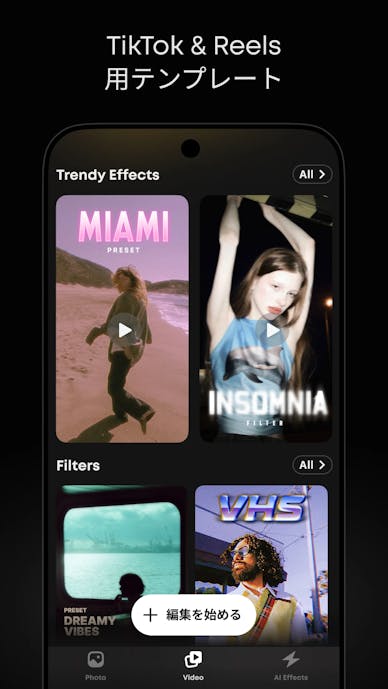 VHS・BLING・MIAMI・PRISMなど映える効果が300種以上揃っていて、写真も動画も同じトーンで統一できます。