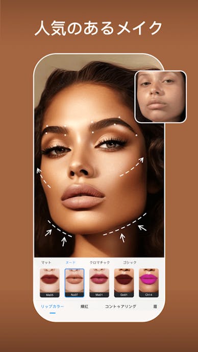 顔まわりはスマートビューティーが最適なスタイルを自動提案し、肌質や顔バランスの微調整が可能。