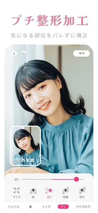撮影中に顔パーツや肌感を整えられる自撮り特化アプリで、目や鼻、口の形を細かく調整しながら好みのバランスに近づけられます。