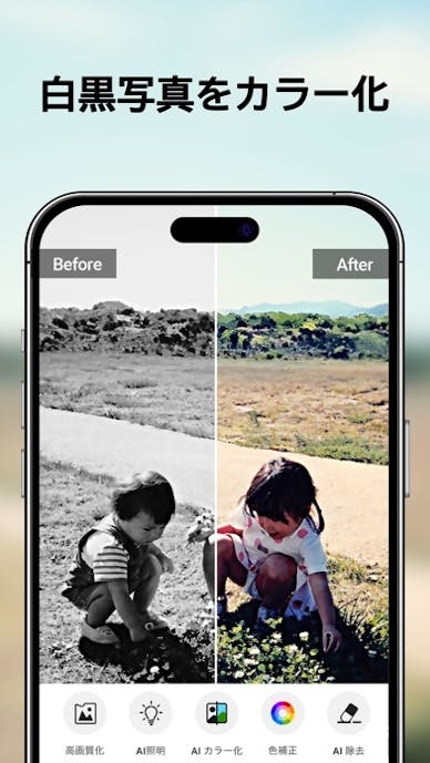 高画質化やノイズ除去、色補正も同じアプリで扱えるため、透かし文字を消した後に写真全体を整えたい時もスムーズ。