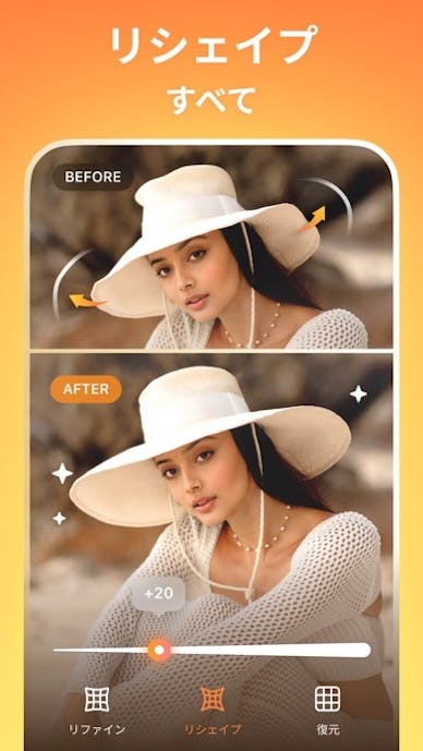 スマホだけで肌レタッチやパーツ補正がそろい、軽い調整から本格的な補正まで直感的に扱えます。