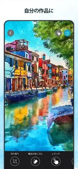 SNSへのワンタップ共有にも対応し、水彩風ポートレートや風景をそのまま投稿用画像として扱えますよ。