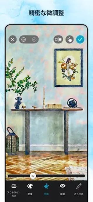 水彩フィルターのあとに、明るさやコントラストを整えられる補正機能も利用可能。