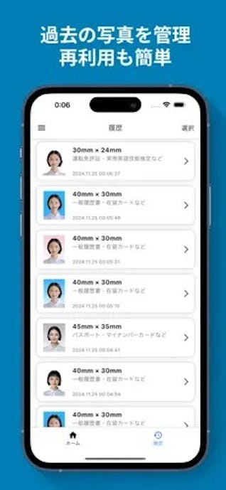 スマホで撮った写真を読み込むだけで、履歴書・パスポート・ビザ・マイナンバー向けの証明写真をまとめて作れます。