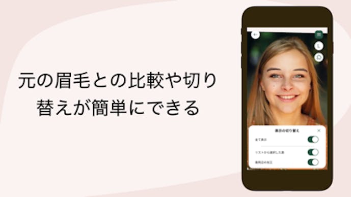 撮影後の眉を消したり薄くしたりする加工があり、メイク前の素眉確認がしやすい点が特徴の一つ。
