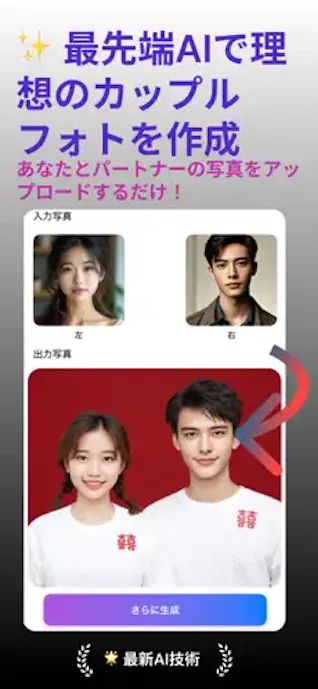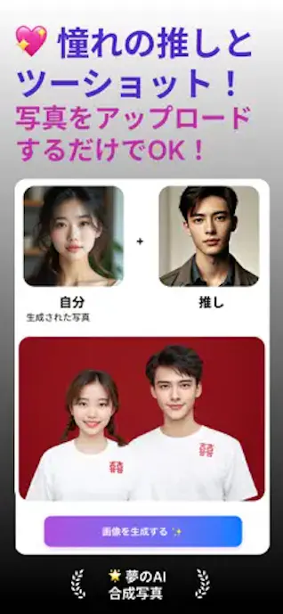 推しと並んで写った写真を作りたい・理想のポーズでツーショットを残したいという人にぴったりなのが、推しとのツーショット写真が作れるAI加工アプリ。